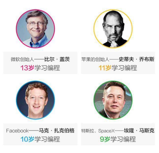 就像我们熟知的世界首富——比尔·盖茨、苹果创始人——乔布斯、Facebook的扎克伯格、特斯拉的埃隆·马斯克……这些时代风云人物都有一个共同点,那就是从小学习编程。